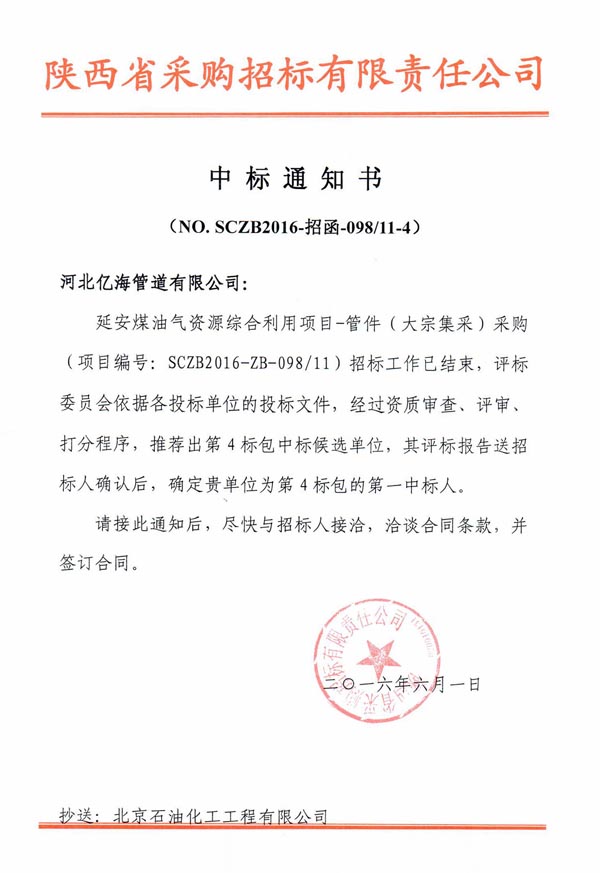公司成功中標(biāo)延長石油延安煤油氣綜合利用項目焊制管件標(biāo)段
